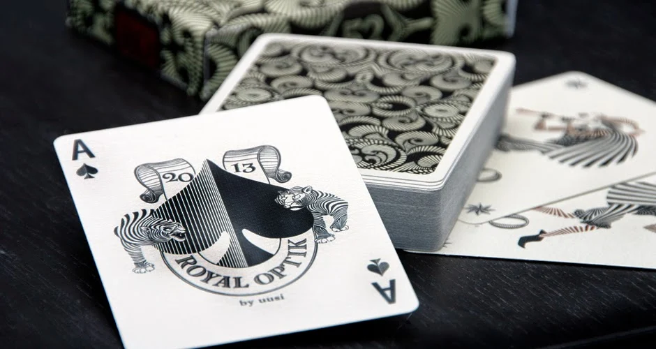 In 2013 Uusi released their next 3 installments to the series, Royal Optik, Blue Blood Redux and Pagan, all via Kickstarter, and all reaching the same success and praise their previous projects had enjoyed. Royal Optik is described as the combination of two art styles “Op Art and Woodcut – coming together to create one completely original playing card deck”. Released in two color variations, Royal Optik was deck 3 in the series.