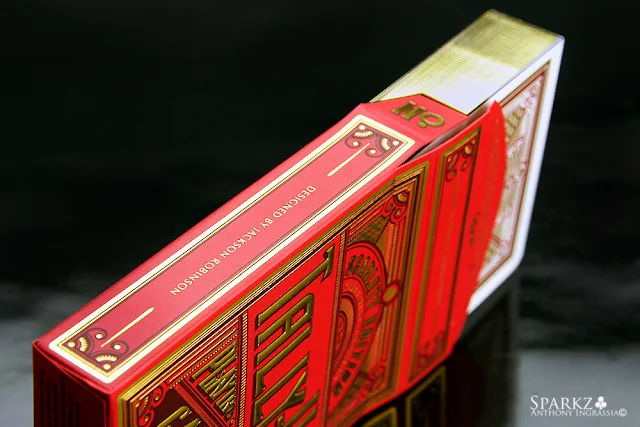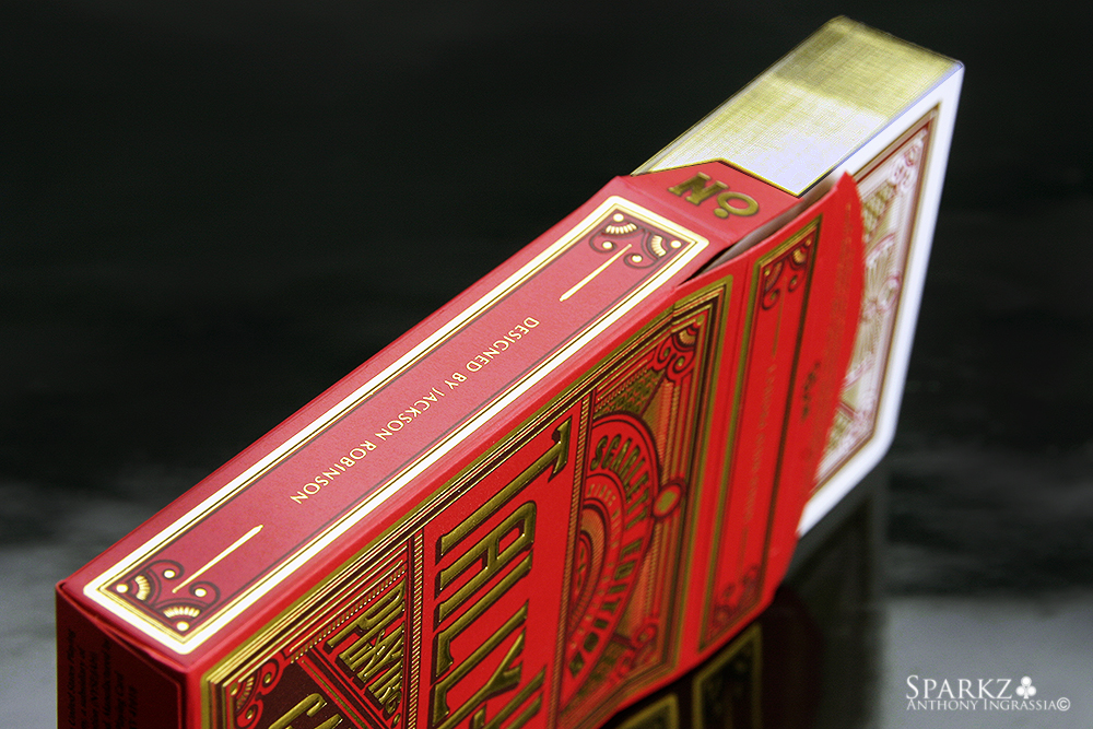 The Tuck is a deep red with Gold Foil accents and embossing as well as a “Lattice” like pattern that embellishes the interior of the tuck to complete the custom case. For those with a keen eye, there is also a secret buried within that I’ll leave for you to discover. The cards themselves have completely custom courts with 2 gold metallic ink accents on the face cards as well as 1 gold metallic ink accent on the back design presented in the bold, intricate design style that we’ve come to expect from KWP. The Ace of Spades as well as the Jokers design are homage to the original key card design and concept.