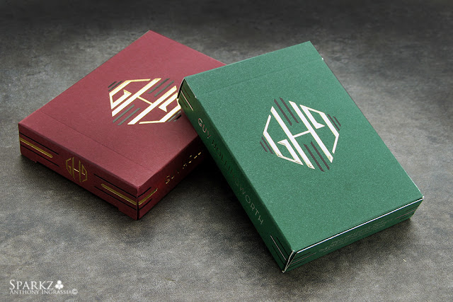 The original Hollingworth deck is presented in a nice Emerald Green and was originally only available in the Hollingworth Collection which included the deck and a collection of DVD’s of the master at his very best. It was also offered with a sleek, clean gold card clip bundle. Most recently the deck has been offered on its own for the first time. The cards handle exceptionally well, feeling a bit thin and light in your hands at first, but retain a nice snap and the handling is very nice. The court cards are accented with metallic inks and the back design has a beautiful “Holographic” pattern of Hollingworths initials “GH” repeating and shimmering with every angle of light that hits it. The tuck is very simple and clean, just the gold foiled “GH” initials on the front, and some foil corner “Framing “on the back of the tuck. My praises go to the look and design of the card backs, they are just hypnotic.