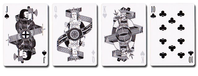The back design has a nice design to it that lends itself well to the theme of the deck; it does have a one way back design due to the varying crowns at each end of the center design. The back also features metallic inks in each respective color. The courts fit really well with the rest of the design and concept, and I like the way the banner/ribbon design brings to the mirror images together. The court cards also receive the metallic ink treatment on the pips as I mentioned as well as some of the design details in the wardrobe and crowns. A nice touch to the overall deck is the four Aces getting the full “Custom” treatment and the decks also include a double backer.
