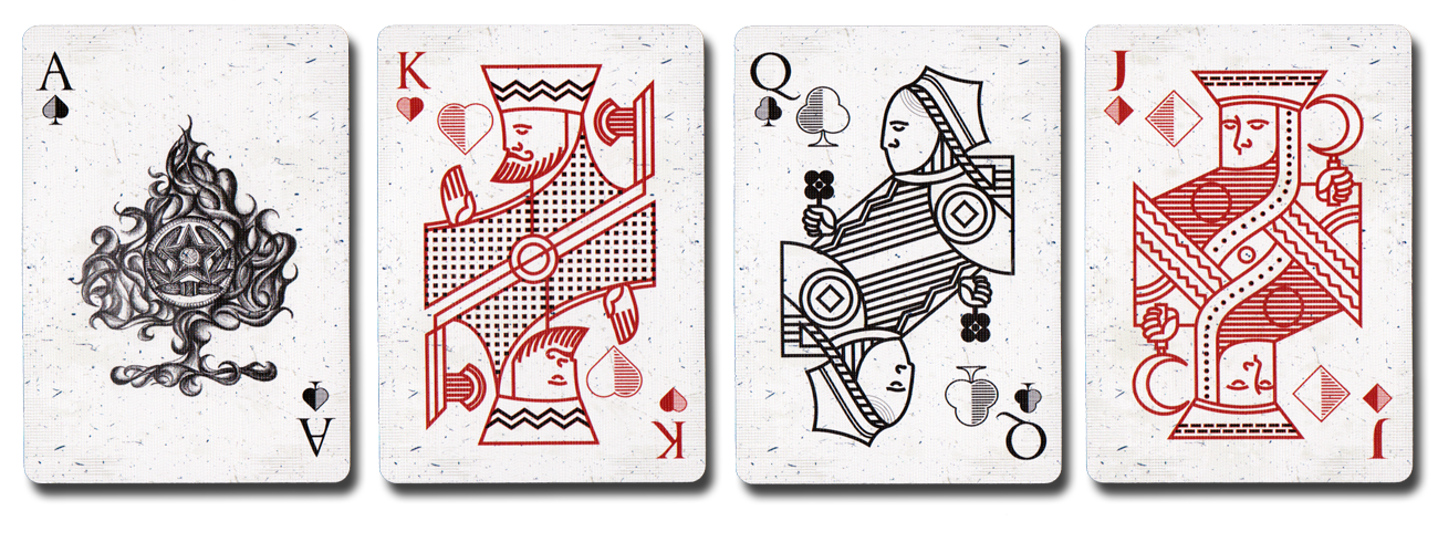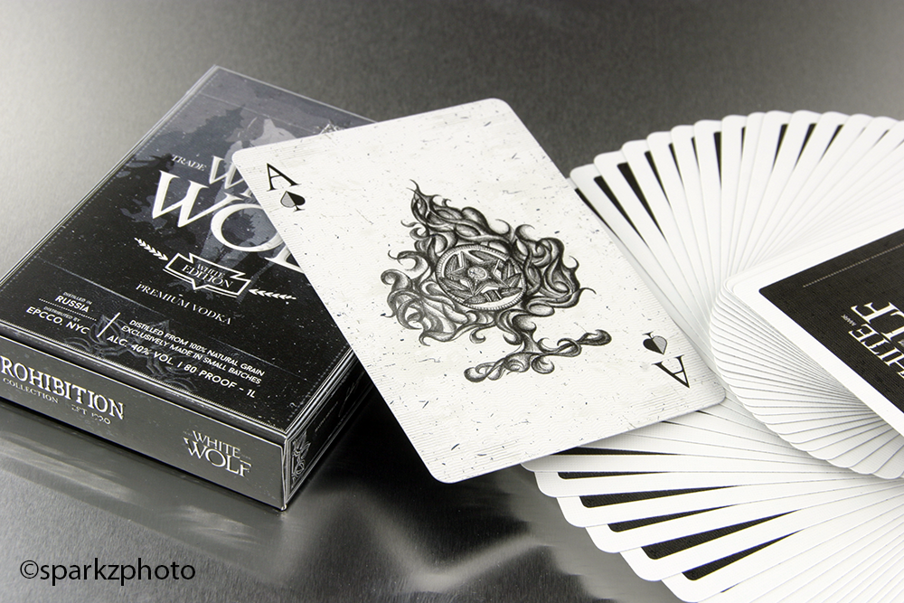 The 1st deck we’ll be looking at is the White Wolf deck. A fictional Premium Vodka designed by Mike Clarke. The deck has a bit of a Casino look to it with the White Wolf logo mirroring itself on either end of the bordered black card backs. The face cards have an interesting “Flecked” pattern as the backdrop of the entire deck; the courts have a modern line art look to them, simple, clean, and a bit of a "heavy" expression to the character model faces. The look does give it a heartier “Russian” feel loseley connecting it to popular Vodka brands.