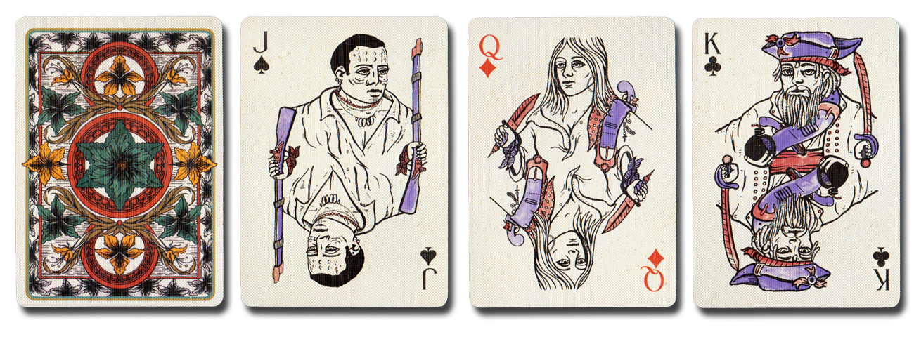 The court cards work really well with the Pirate theme; they are mirrored and continue the “Sketched” look that we’ve seen in the other decks in this series. Each court depicts a pirate arch type and some subtle colors added to the accent pieces of wardrobe give the courts a little depth. If you looked at this as a period piece in terms of its design and concept, the courts fit the bill. I know many will find it easy to criticize the court design and this day and age I can understand and see why, but I urge you to look at this deck as a whole, because I think that’s where it shows its overall presentation the best.