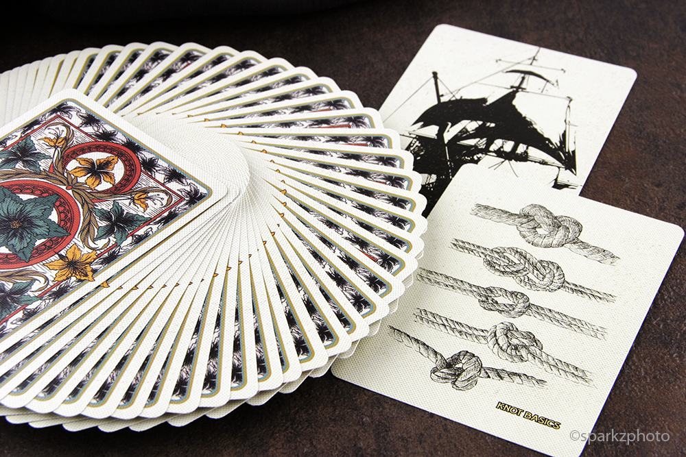 The cards themselves feature pretty standard pips on the spot cards, but the deck is a very light “Sea Foam Green” with some very subtle and light speckling on the background. The two “Jokers”, once again, not designated as such in any way, but I would assume that’s the category they would fit, are inspired by the high seas, with one featuring a silhouette of a large ship with bellowing sales and the other showing some “Knot Basics”. The deck also includes an add card for the Prohibition set, found in all the decks as is the additional recipe card. The custom Ace of Spades is a great center piece to this deck, again using the earthy greens and yellows from the back design to frame a Macaw in a floral pattern in the shape of a Spade. The “Rebellion Rum” logo slightly covering the birds outstretched tail feathers.