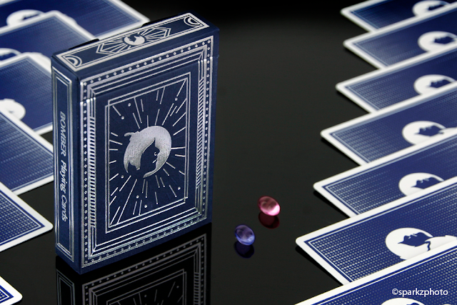 The images in this piece are of the Limited Edition Deep Maroon deck, the cards themselves in each version are again pretty much the same with the exception of the back designs color palette. The Limited Edition version of each color is presented with a full color back design, while the Standard version is a monochromatic version of each signature color. The back design features mirrored "Bucks" in a familiar "Rider Back" design, with an intricate floral scroll work that breaks the border just a bit here and there. The Ace of Spades is perfectly designed for this deck, with a Buck head featuring some beautifully ornate design work around his antlers. The Jokers come in two colors, the colors of each deck, and have some really nice typography, script and floral accent.